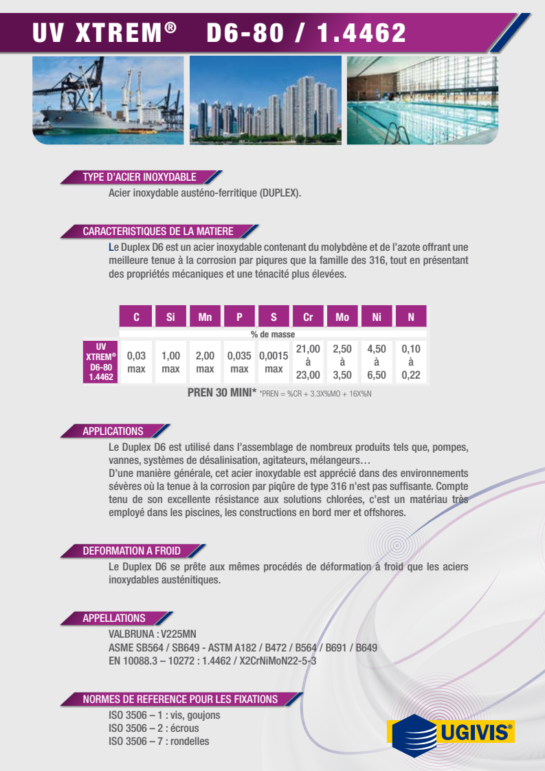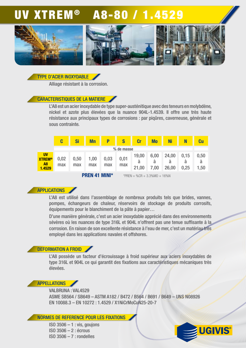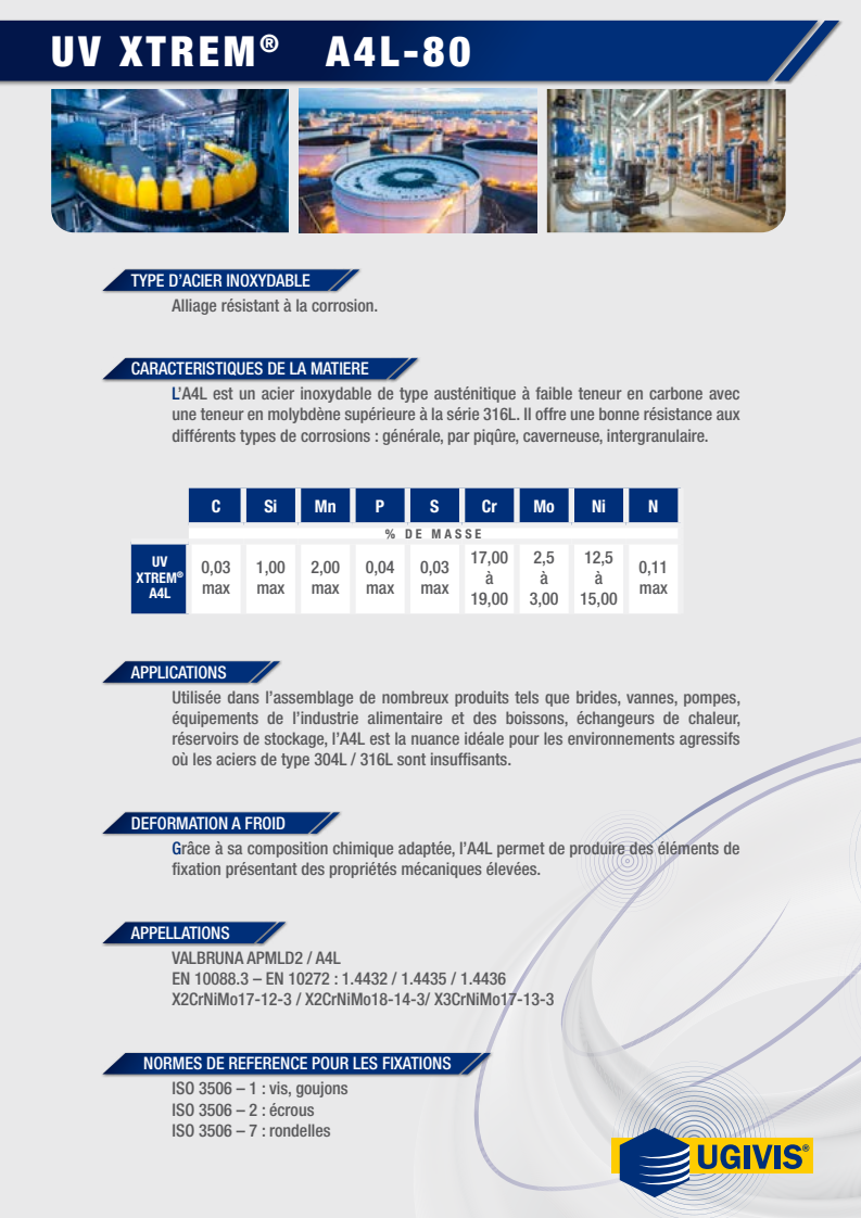 - Les produits UV-Xtrem vendus sous la présente marque et effectivement fabriqués par UGIVIS sont garantis conformes aux dernières éditions des normes internationales en vigueur pour la visserie en aciers inoxydables UGIVIS remplacera sans frais pour l’acheteur, hors coût d’expédition, les produits dès lors qu’il est démontré qu’ils n’ont pas été soumis à un usage non-conforme et qu’ils n’ont pas été modifiés ou altérés lors de l’assemblage.